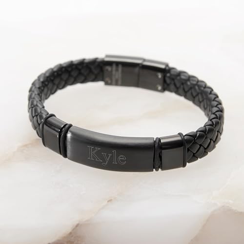 • Features: Stylish men's leather bracelet with engravable stainless steel nameplate. Custom engrave a name, initials, date or something of meaning on the front or back nameplate. Custom engraved men's bracelets are a perfect way to commemorate a birthday, anniversary or just because gift. Engrave this men's bracelet with his name, nickname, or a unique inscription on the front for a personal keepsake he'll treasure.