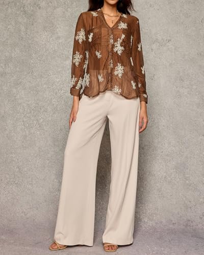 HOT ! Women's Long Sleeve Sheer Floral Embroidered See Through Button Down Blouse Lightweight Boho V Neck Shirts
